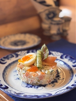 БЛИНЫ С СОЛЕНЫМ ЛОСОСЕМ И СОУСОМ175 / 50 гр. |
