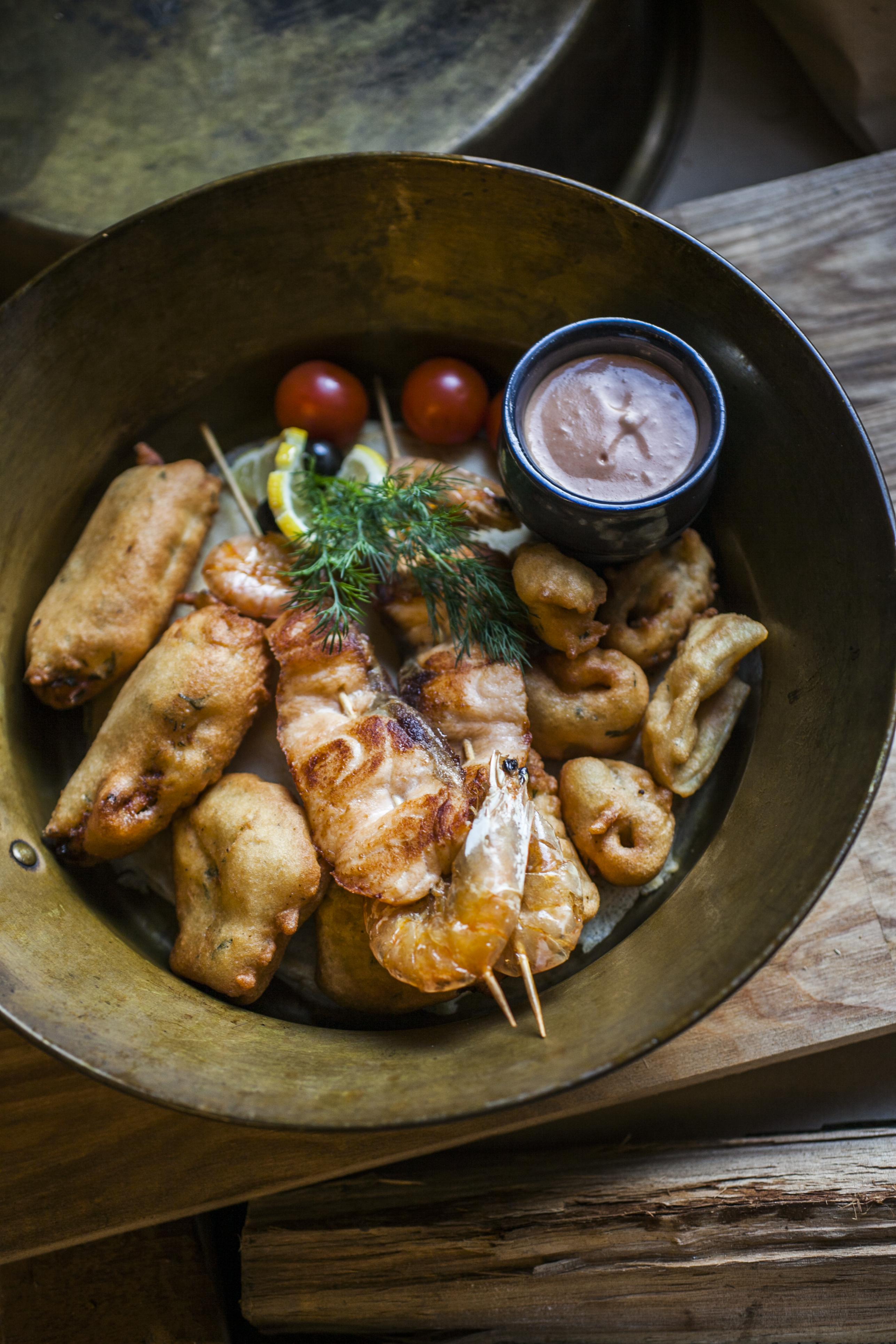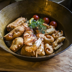 Судак в кляре - 420 руб Креветки отварные или жареные в соусе сладкий чили - 630 руб Кольца кальмара в кляре - 420 руб Гренки с сыром/ с чесноком - 350 руб Попкорн из куры - 380 руб